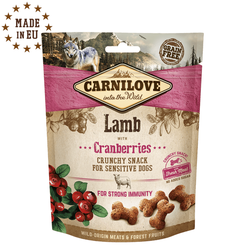 Carnilove Dog Crunchy Snack Lamb & Cranberries 200 g je výbornou volbou jako zdravá odměna, která podporuje trávení, imunitu a celkovou vitalitu psa.