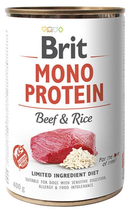 Brit Dog konz Mono Protein Beef & Brown Rice 400g je krmivo s jedním zdrojem živočišné bílkoviny – hovězím masem, které obsahuje 100 % hovězí bílkoviny a hnědou rýži, jež poskytuje vlákninu a komplexní sacharidy. Díky této kombinaci je vhodné pro psy s citlivým trávením nebo potravinovými alergiemi na jiné druhy masa.
