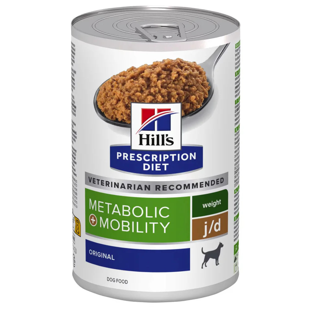 Hill's Prescription Diet j/d Metabolic + Mobility 370 g je veterinární dieta určená pro psy s nadváhou a současně s problémy pohybového aparátu, zejména kloubů. Kombinuje klinicky ověřenou podporu redukce hmotnosti s nutričními složkami, které zlepšují hybnost a komfort pohybu. Krmivo je dostupné výhradně na doporučení veterinárního lékaře a nákupem potvrzujete, že jej váš veterinář předepsal na základě zdravotního stavu vašeho psa.