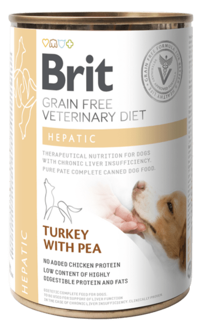 Brit VD Dog GF konz Hepatic 400 g je veterinární dietní krmivo určené pro psy s onemocněním jater nebo poškozením jaterní tkáně v důsledku zánětu, intoxikace, léčby léky nebo metabolických poruch. Je navrženo tak, aby podporovalo regeneraci jater, chránilo hepatocyty a optimalizovalo metabolismus tuků i bílkovin.