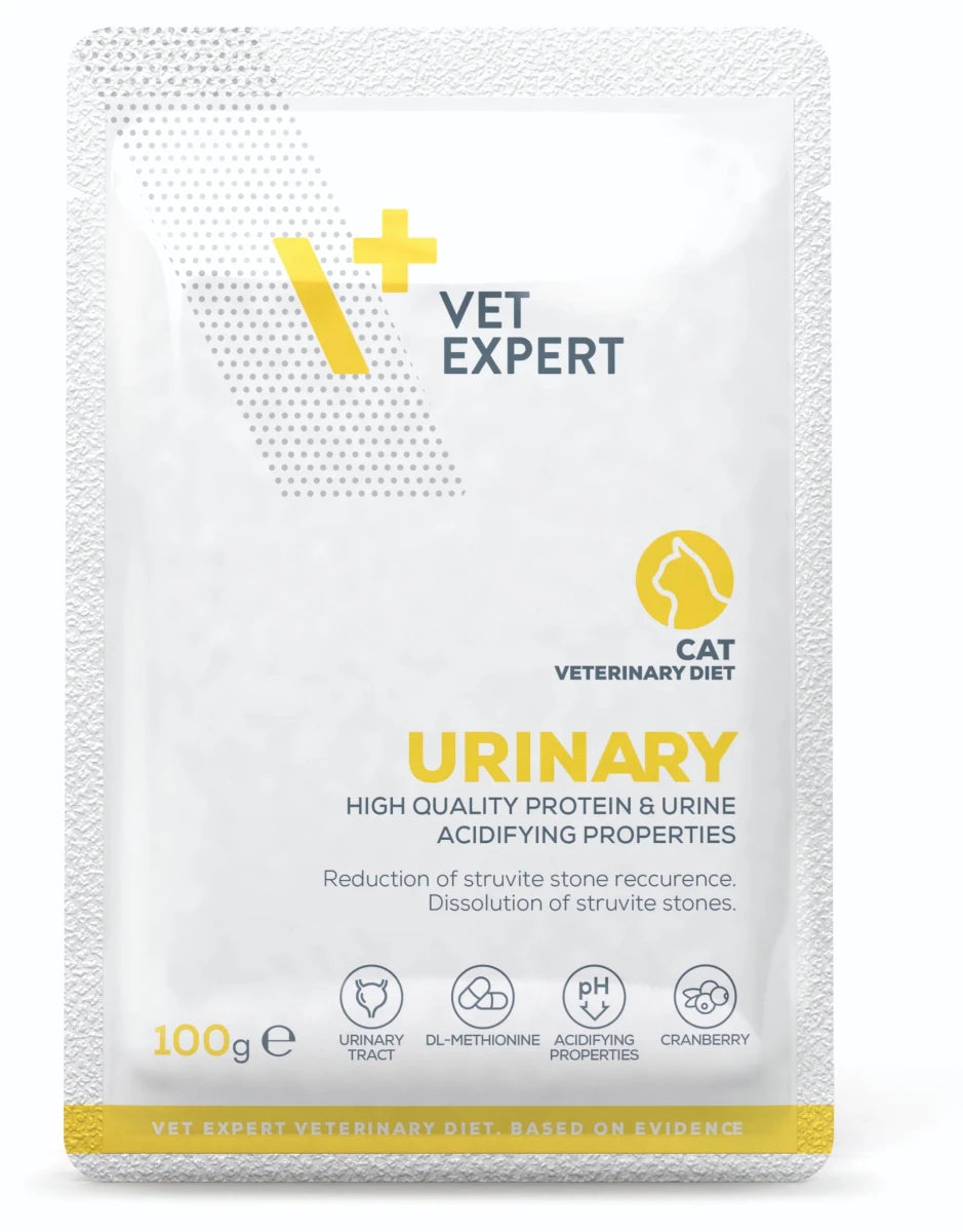 VetExpert VD 4T Urinary Cat kapsa 100g je veterinární dieta speciálně formulovaná pro kočky s problémy dolních močových cest, včetně idiopatické cystitidy, urolitiázy a recidivujících infekcí močového ústrojí. Obsahuje pečlivě vybrané složky pro okyselení moči, snížení minerálních koncentrací vedoucích ke vzniku struvitových kamenů a podporu zdravého močového traktu.