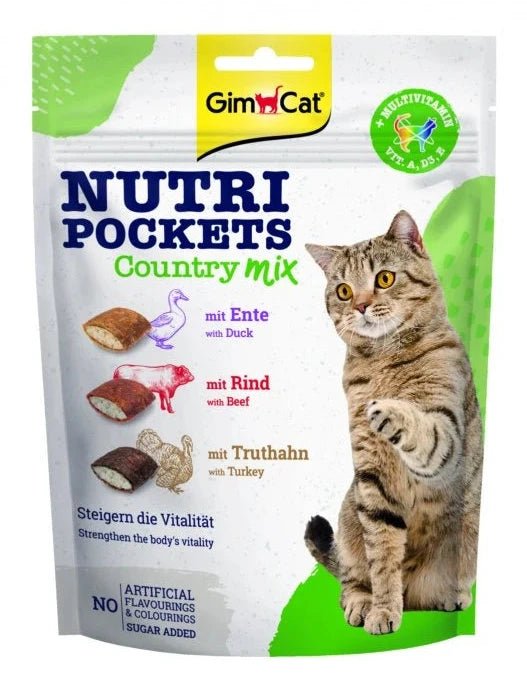GimCat Nutri Pockets Country Mix 150g jsou lahodné křupavé polštářky s náplní, které obsahují méně než 2 kalorie na kus a neobsahují cukr, umělá barviva ani konzervační látky. V každém balení naleznete tři druhy polštářků s náplněmi z kachního, hovězího a krocaního masa, obohacené o vitamíny posilující vitalitu koček.