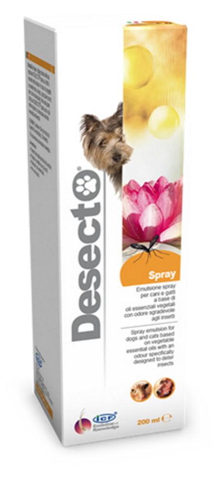 Desecto repelentní spray pro psy a kočky 200 ml je účinný prostředek k ochraně vašich mazlíčků před obtěžujícím hmyzem. Díky obsahu specifických esenciálních olejů poskytuje nejen ochranu, ale také péči o pokožku a srst.