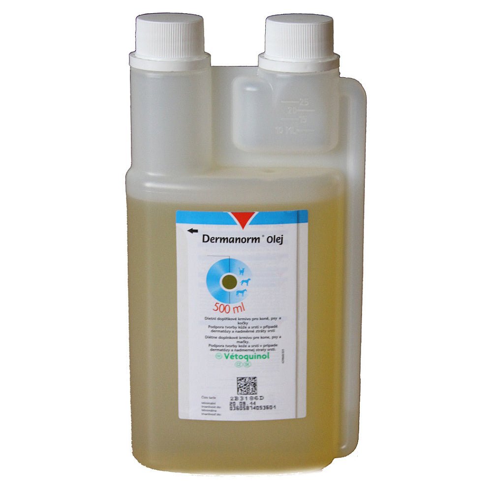 - Podpora zdravé srsti a pokožky: Dermanorm olej je bohatý na esenciální mastné kyseliny, jako jsou omega-6 a omega-3, které přispívají k lesklé srsti a zdravé pokožce, což je obzvláště prospěšné pro psy a kočky s kožními problémy.