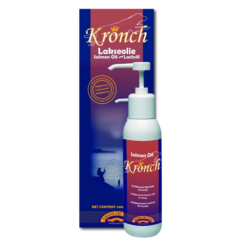 Lososový olej KRONCH pro psy a kočky, 1 l. Výživný a zdravý, ideální pro podporu zdraví srsti a kůže domácích mazlíčků.