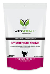 VetriScience UT Strength podpora močových cest pro kočky 90 g je funkční doplněk zaměřený na zdraví močového měchýře, prevenci opakujících se zánětů a podporu komfortu u koček se sklony k potížím s močením. Kombinace D-mannosy, glukosaminu z korýšů, brusinek, bromelainu, kukuřičného hedvábí a probiotické kultury působí přímo na sliznici močového měchýře, bakteriální adherenci i lokální zánět.