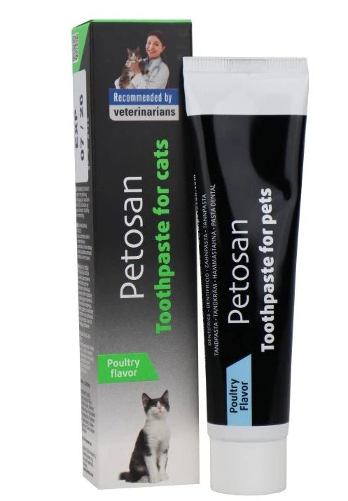Petosan zubní pasta drůbeží pro kočky 85g tuba je speciálně vyvinutá pro potřeby ústní hygieny koček. Tato pasta s příchutí drůbežího masa je navržena tak, aby podporovala zdraví zubů a dásní vaší kočky, zároveň je chutná a snadno přijímaná většinou koček.