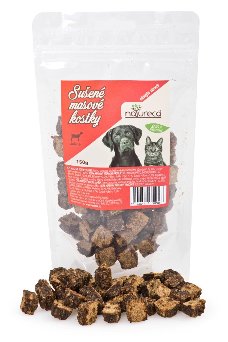 NATURECA Masové kostky Jehně, 100% maso 150g jsou výborným pamlskem pro vašeho mazlíčka, ideálním pro ty, kteří hledají kvalitní a zdravou alternativu. Tento produkt obsahuje čisté jehněčí maso, které je bohaté na živiny a chutné pro psy i kočky.