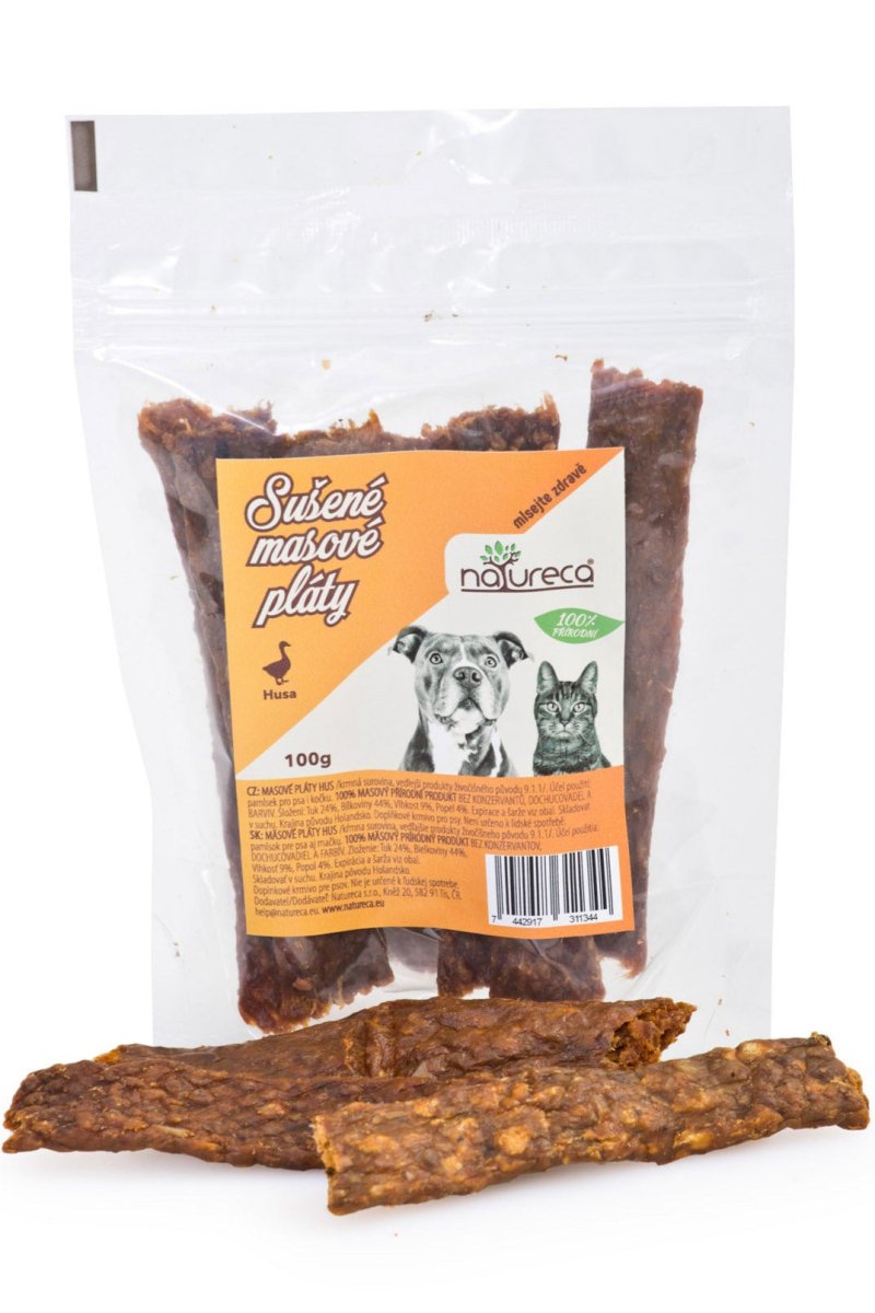 NATURECA Masové pláty Husa, 100% maso 100g jsou vynikající pamlsek pro vašeho mazlíčka, který obsahuje pouze čisté maso z husy. Tento produkt je ideální jako odměna nebo jako součást běžné stravy pro psy a kočky.