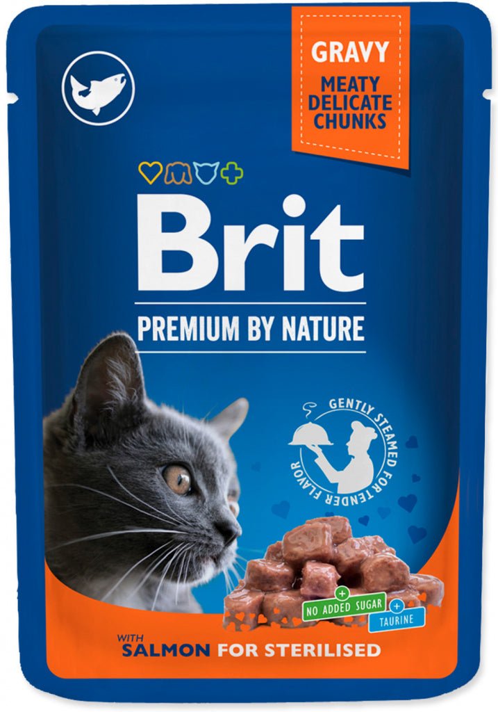 Brit Premium Cat Salmon for Sterilised 100g je ideální krmivo pro sterilizované kočky, které obsahuje 85 % lososa. Losos je výborným zdrojem bílkovin a zdravých tuků, což přináší mnoho zdravotních výhod, zejména pro kočky s nižšími energetickými potřebami po sterilizaci.