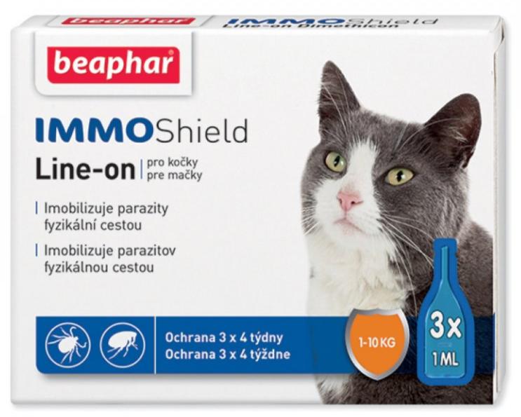 Produkt Line-on IMMO Shield pro kočky obsahuje tři pipety s každou 1 ml. Tento přípravek je určen k léčbě a prevenci napadení blechami a klíšťaty u koček.