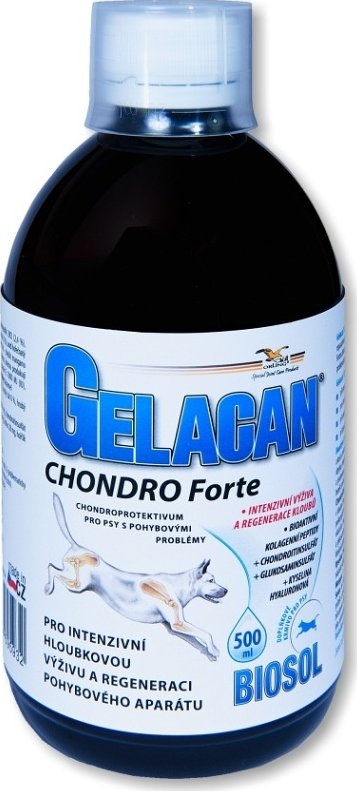 Gelacan Chondro Forte Biosol 500ml je tekutý doplněk stravy určený k podpoře zdraví kloubů a pohybového aparátu u psů. Je ideální pro psy všech velikostí, zejména však pro starší psy nebo psy s vyšší fyzickou zátěží a predispozicemi ke kloubním problémům.