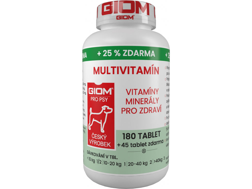 Giom S pro psy Multivitamín (180 tbl + 25% zdarma) je doplněk stravy, který: