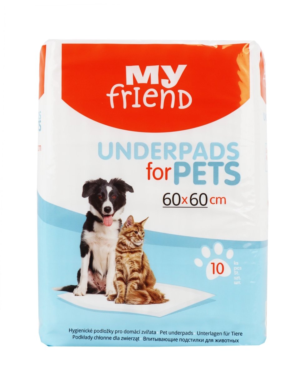Podložka 60x60 cm MY FRIEND, balení 10 ks. Absorpční a hygienická, ideální pro udržení čistoty a pohodlí pro domácí mazlíčky.