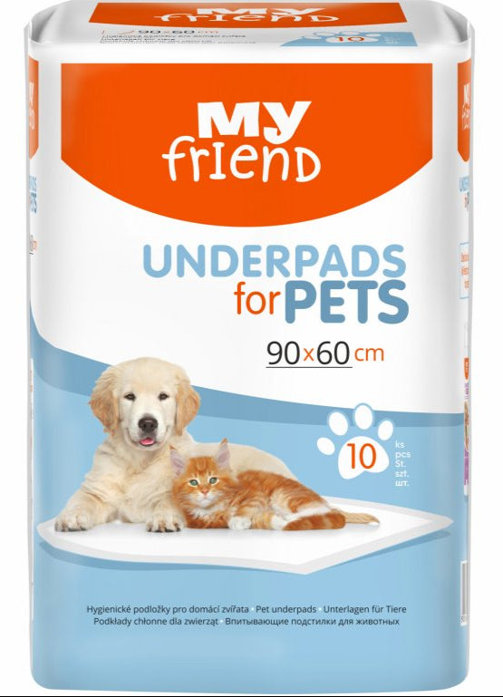 Podložka 60x90 cm MY FRIEND, balení 10 ks. Větší a absorbční, ideální pro pohodlí a hygienu domácích mazlíčků na větších plochách.