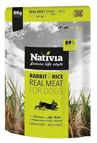 Krmivo pro psy Nativia Real Meat Rabbit&Rice 8kg s králičím masem a rýží.