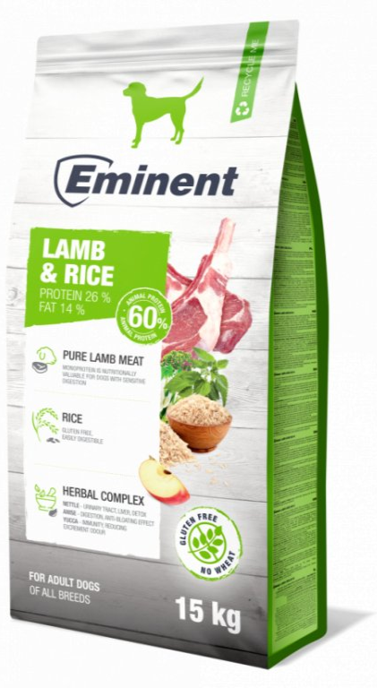 \nEminent Dog Lamb Rice 15kg je hypoalergenní krmivo s jehněčím masem a rýží, ideální pro psy s citlivým trávením a alergiemi. Podporuje zdraví a pohodu.