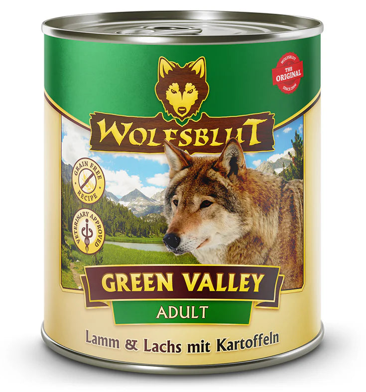Wolfsblut Dog Adult Green Valley konz. 800g je vysoce kvalitní kompletní krmivo pro dospělé psy, které spojuje jehněčího masa a lososa do vyvážené receptury zaměřené na výživu svalů, kloubů, kůže a srsti. Vhodné pro psy s citlivým trávením nebo alergiemi na běžné zdroje bílkovin.