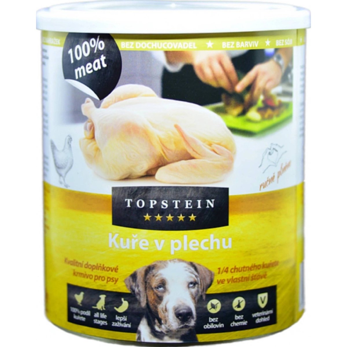 Topstein Kuře v plechu 800g je ideální pro štěňata, dospělé psy i seniory, nabízí 100% kuřecí maso bez přídavků. Toto krmivo je vhodné pro psy všech věkových kategorií.