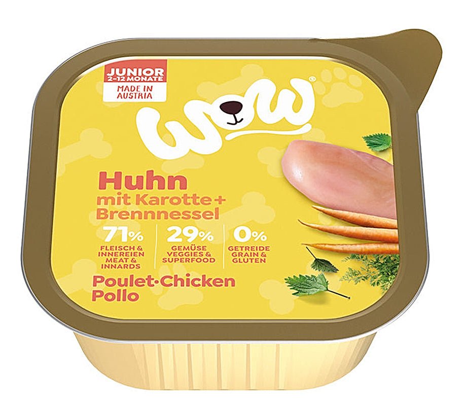 WOW Kuřecí s karotkou Junior 150g je krmivo vyvinuté speciálně pro štěňata, které podporuje růst a zdravý vývoj díky vysokému obsahu kvalitních živočišných bílkovin a dalších cenných složek.