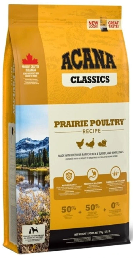 Acana Classics Prairie Poultry 14,5 kg je kompletní krmivo pro psy všech plemen a věkových kategorií. Obsahuje 50 % živočišných surovin, včetně volně chovaných kuřat, krůt a celých vajec z hnízdních chovů.