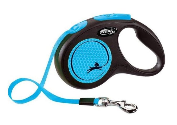 Vodítko FLEXI Neon S pásek 5m/15kg černá/modrá NEW je navrženo pro malé psy s hmotností až do 15 kg, poskytující bezpečnost a pohodlí během procházek.