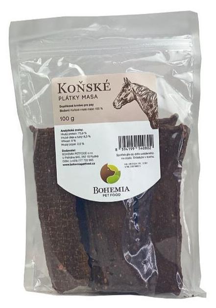 Plátky koňského masa, 100g. Výživné pamlsky s vysokým obsahem bílkovin, ideální pro psí sportovce a aktivní psy.