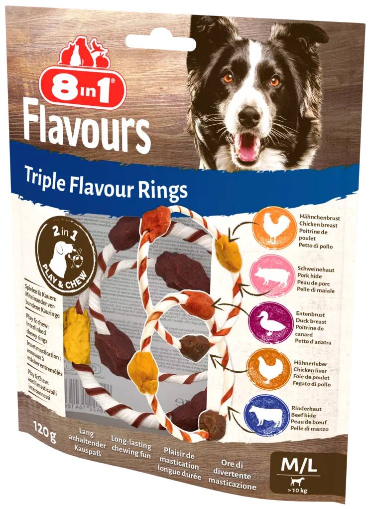 Pochoutka 8in1 Triple Flavour Rings M/L je prémiová žvýkací pochoutka vytvořená pro střední a velká plemena psů.