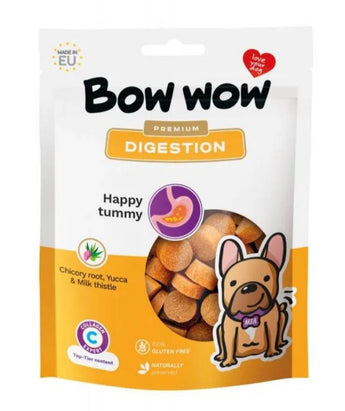 Bow wow Digestion 60 g je funkční pamlsek zaměřený na podporu trávicího traktu, detoxikaci organismu a zdraví pohybového aparátu. Díky cíleně zvoleným složkám může být vhodný pro psy s citlivým zažíváním nebo při potřebě dlouhodobé podpory kloubů.