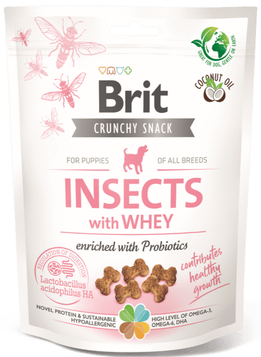 Brit Care Dog Crunchy Cracker Insect Puppy Whey Probiotics je skvělá volba pro štěňata, která podporuje zdravé trávení a růst díky kombinaci hypoalergenní hmyzí bílkoviny a probiotik.