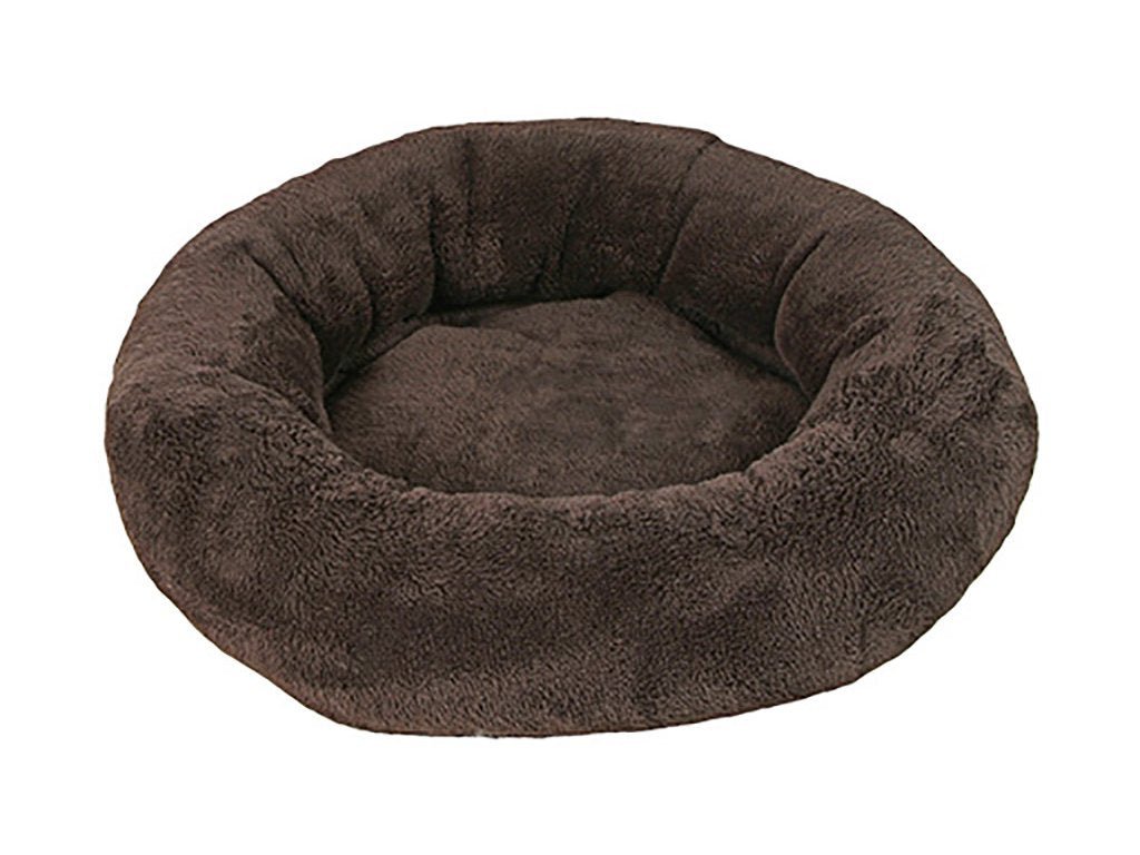Hnědý plyšový pelech o průměru 50 cm, poskytuje útulný prostor pro odpočinek.