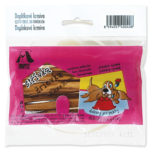 Pochoutka sušená MAPES střívka 10cm 10ks je přírodní a chutný produkt vhodný pro všechny psy, který podporuje zdraví zubů a poskytuje bohatý zdroj energie díky vysokému obsahu tuku.