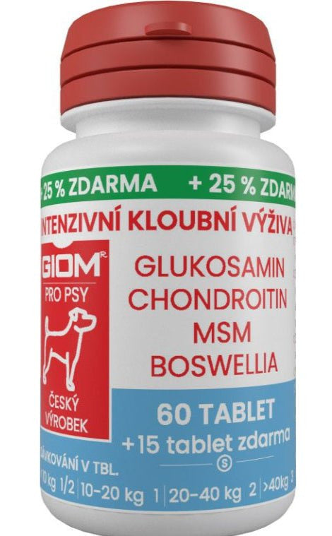 Giom S pro psy Intenzivní kloubní výživa (60 tablet + 25% zdarma) je vysoce účinný doplněk stravy, který podporuje zdraví kloubů a pohybového aparátu u psů. Tento produkt nabízí: