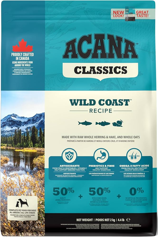 Acana Classics Wild Coast 2 kg je kompletní krmivo pro psy všech plemen a věkových kategorií. Obsahuje 50 % živočišných surovin, včetně volně lovených ryb, jako jsou pacifický sleď, platýs a stříbrný hejk, které jsou rychle dopraveny čerstvé a celé do kuchyní pro zpracování, což zajišťuje vysokou kvalitu bílkovin a přirozenou chuť.