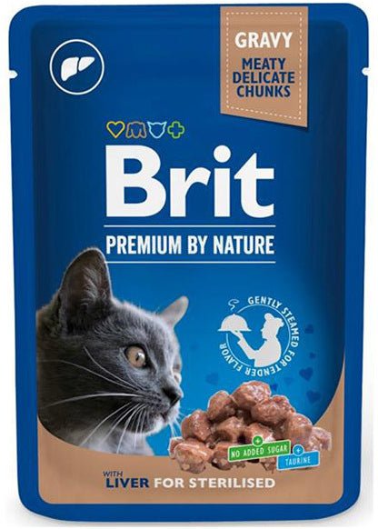 Brit Premium Cat Liver for Sterilized 100 g je mokré krmivo určené pro sterilizované kočky, obsahující vysoký podíl masa, konkrétně 85 % jater a dalších živočišných složek. Toto krmivo je bohaté na bílkoviny a živiny, které podporují zdraví sterilizovaných koček a pomáhají udržovat optimální tělesnou hmotnost.