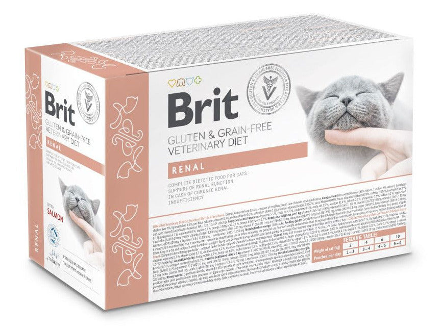 Brit VD Cat Pouch Fillets in Gravy Renal 12x85g je veterinární dietní krmivo určené pro kočky s chronickým nebo akutním onemocněním ledvin (CKD). Receptura s nízkým obsahem fosforu, vysoce stravitelnými bílkovinami a zvýšeným obsahem omega mastných kyselin chrání ledviny, podporuje detoxikaci organismu a zlepšuje celkovou pohodu kočky. Tento produkt je veterinární dietou – lze ho používat pouze na doporučení veterináře, a nákupem potvrzujete, že dietu předepsal veterinární lékař.