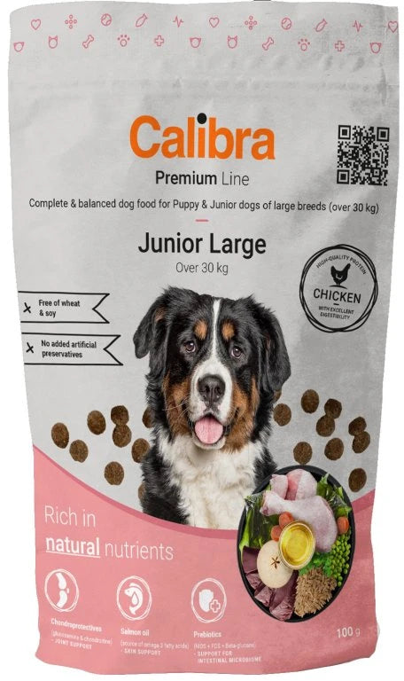 Calibra Dog Premium Line Junior Large (100 g) je krmivo navržené pro štěňata velkých plemen, která potřebují specifické výživové hodnoty pro zdravý růst a vývoj. Na základě údajů dostupných na stránkách výrobce, doporučené dávkování tohoto krmiva je následující: