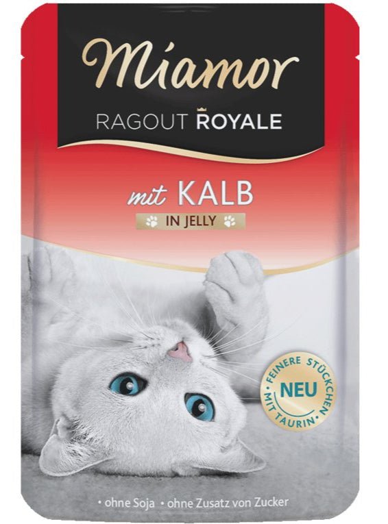 Miamor Cat Ragout Royale telecí v želé 100g je doplňkové krmivo s obsahem 10 % telecího masa, které je zdrojem živočišné bílkoviny a železa. Vhodné jako chuťovka nebo doplněk k plnohodnotné stravě, ale nelze jej doporučit jako kompletní výživu.