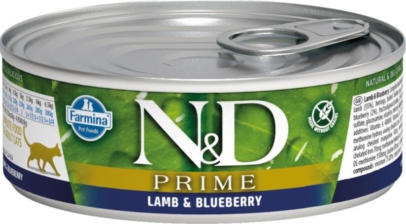 N&D PRIME CAT Adult Lamb & Blueberry 70g je konzervované krmivo, které nabízí vysokou kvalitu surovin a je navrženo tak, aby podporovalo zdraví dospělých koček s důrazem na přírodní složky a vyvážené nutriční hodnoty.